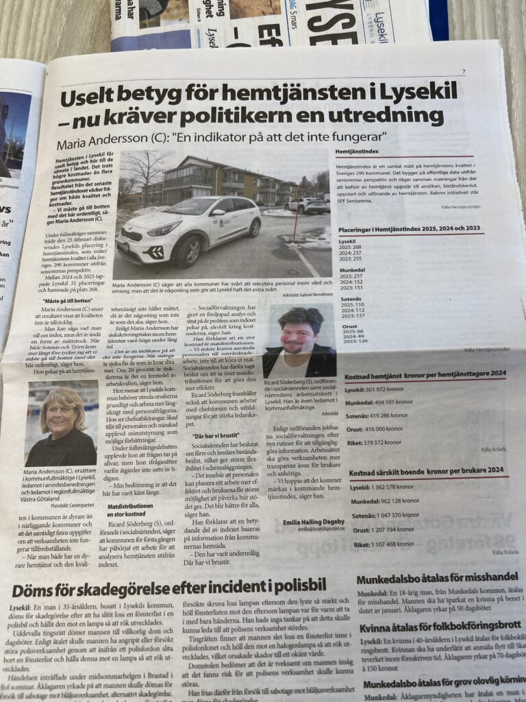 I den senaste sammanställningen framgår att Lysekil är placerad på plats 268 vilket väcker frågor kring både resultat och insatser för att förbättra kvaliteten. Placeringen är en försämring från tidigare år. Det är av stor vikt att våra medborgare kan känna sig trygga och nöjda med den omsorg som erbjuds via hemtjänsten, samt att Lysekil är en attraktiv kommun för äldre.